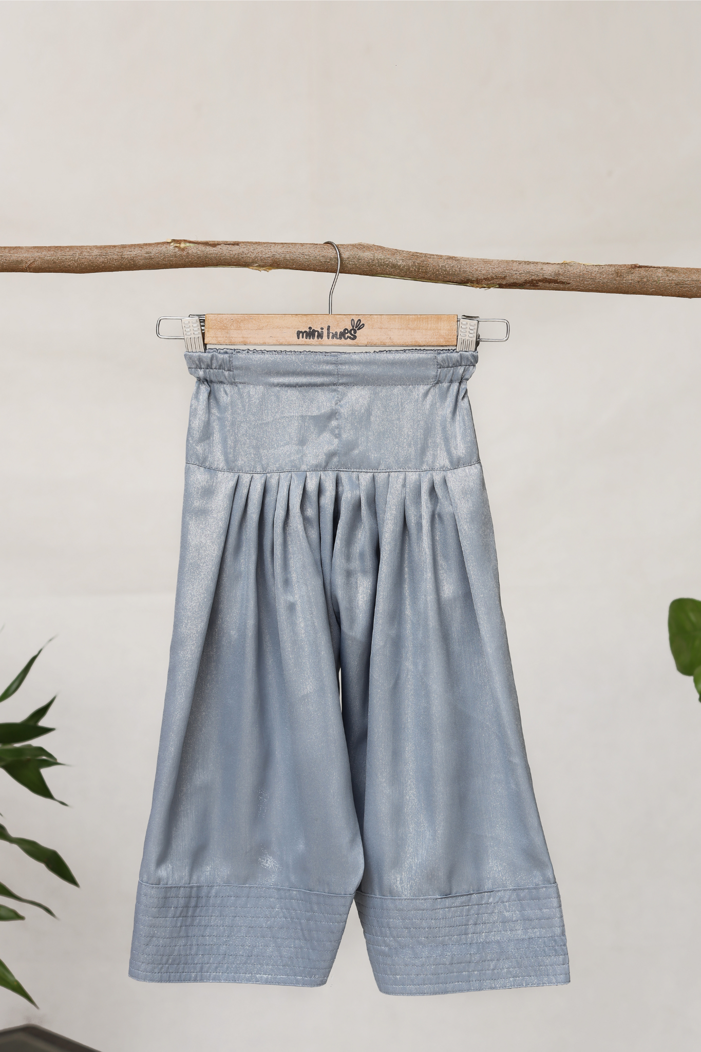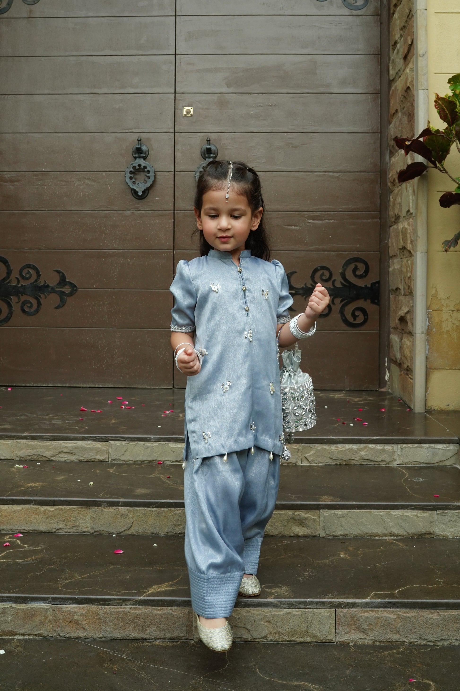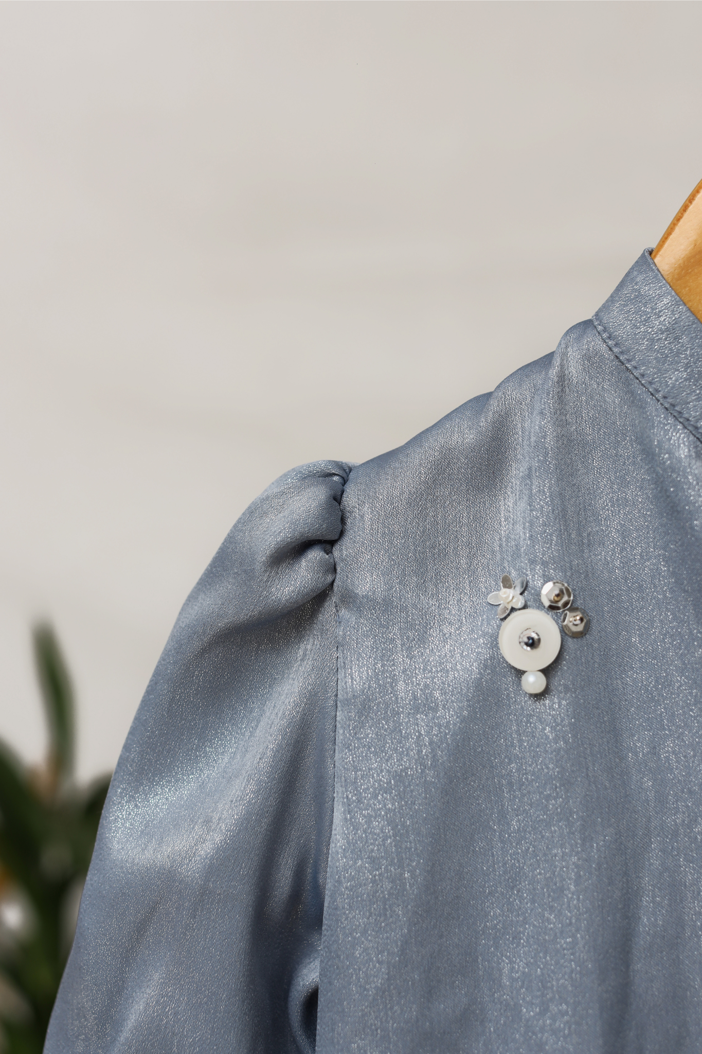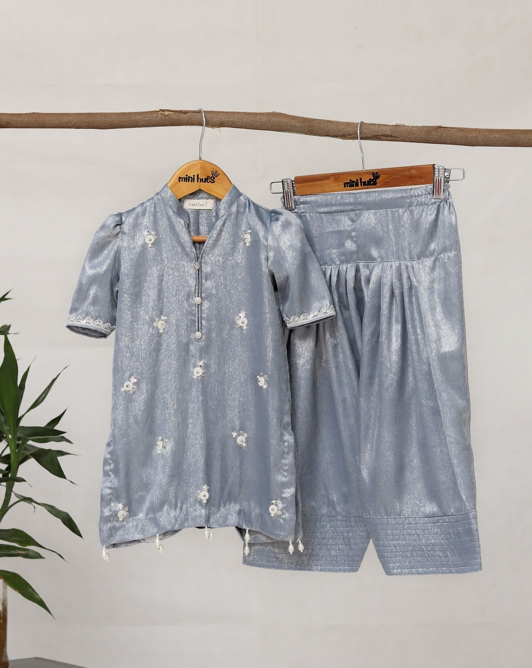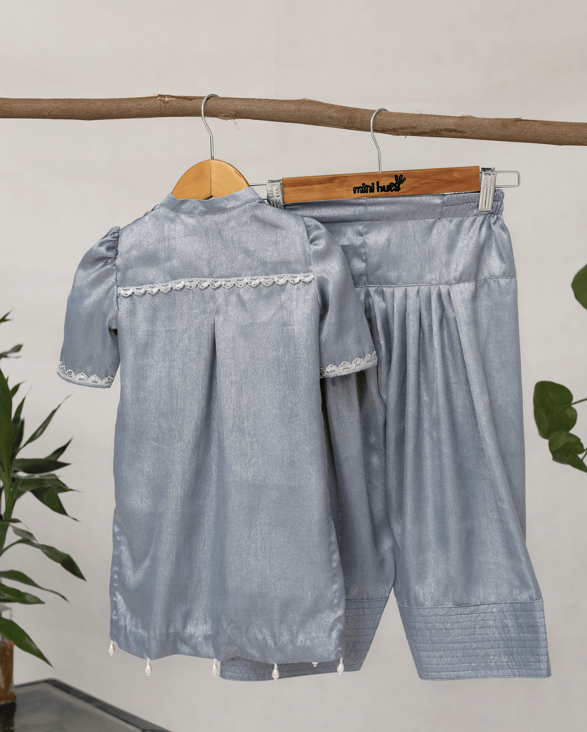 Two-piece set in matte silver shimmer silk, featuring a band-collar short shirt with metallic buttons, 3D hand-embellished motif work on the front, puffed sleeves, lace detailing, and delicate pearl dangles along the front and back hemline. Paired with a matching farshi shalwar.