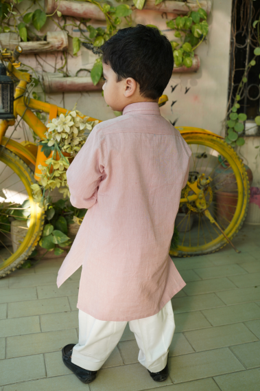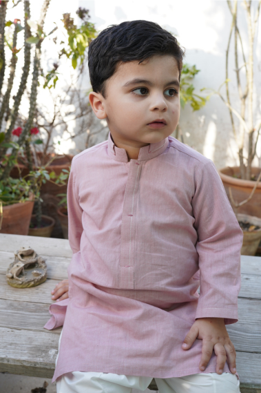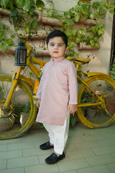 This summery peachy pink kurta shalwar set featuring a straight cut shirt with a neat double collar and placket patti with white running stitch details on the collar and placket with tonal bartext, along with full length kurta sleeves comes with milky white shalwar