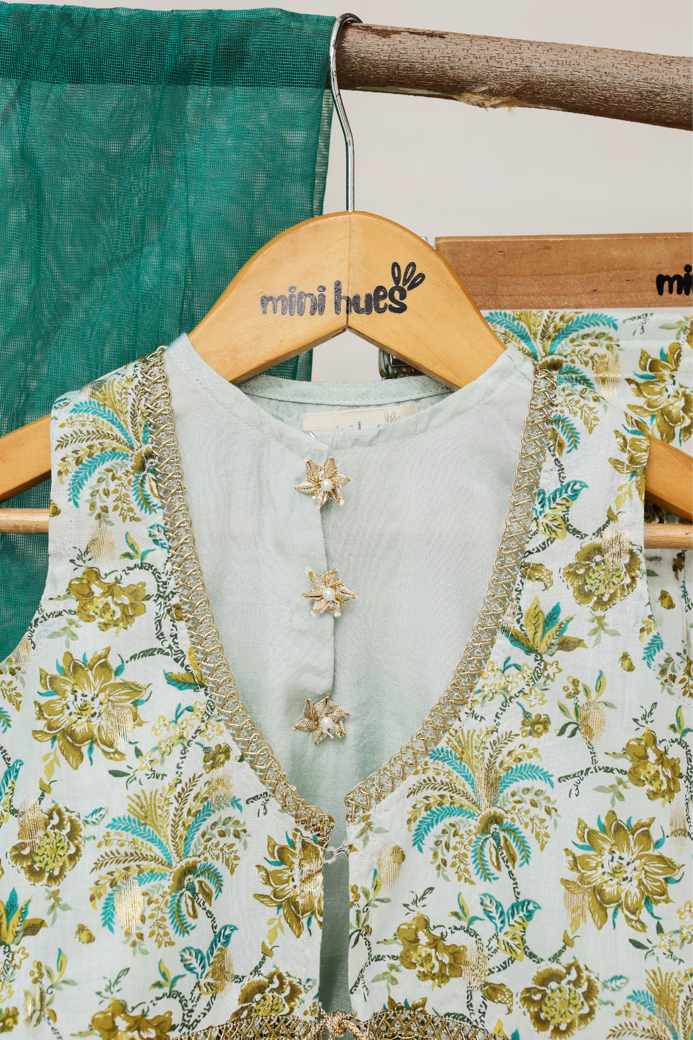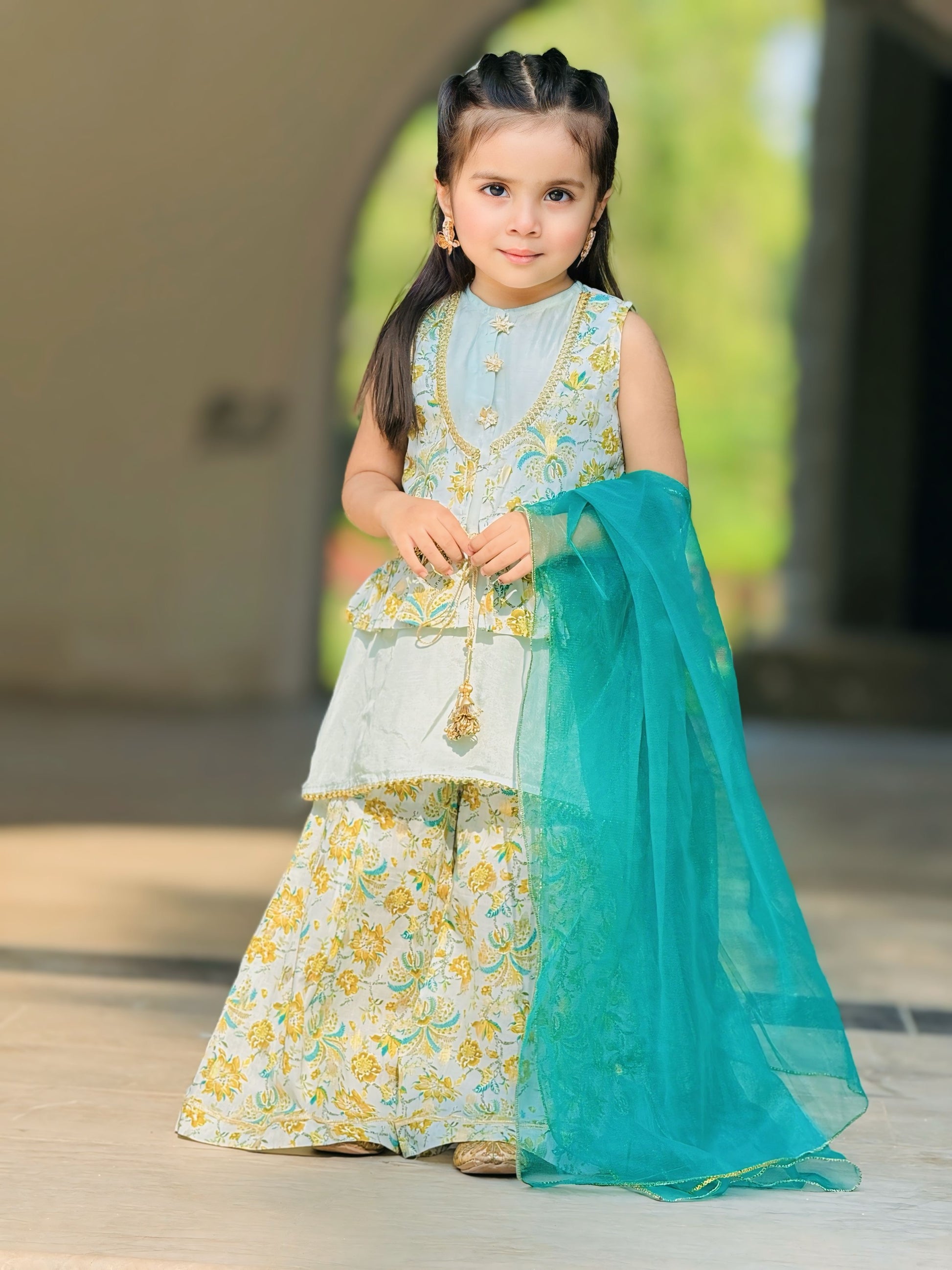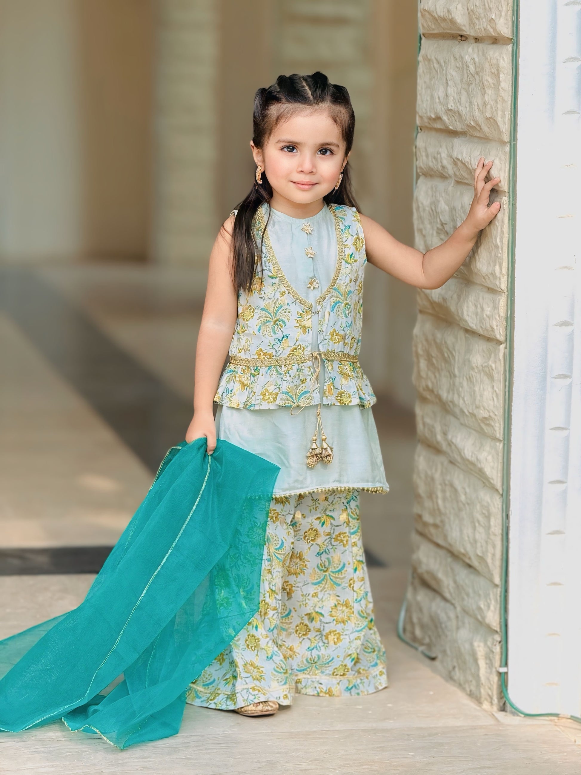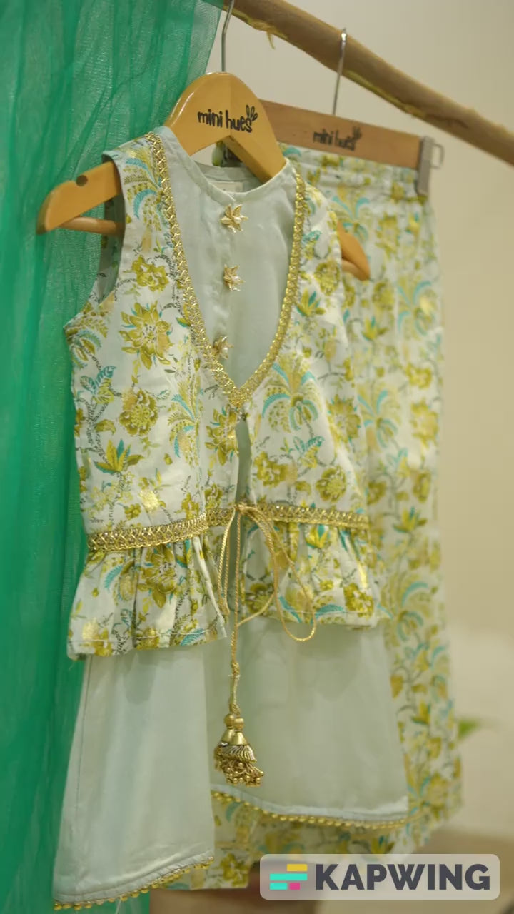 This three-piece set features an aqua blue silk sleeveless flared shirt with gold pearl lace edging and floral gotta buttons, paired with zari-printed flared pants and a sleeveless printed jacket (koti), finished with lace and tassel details.