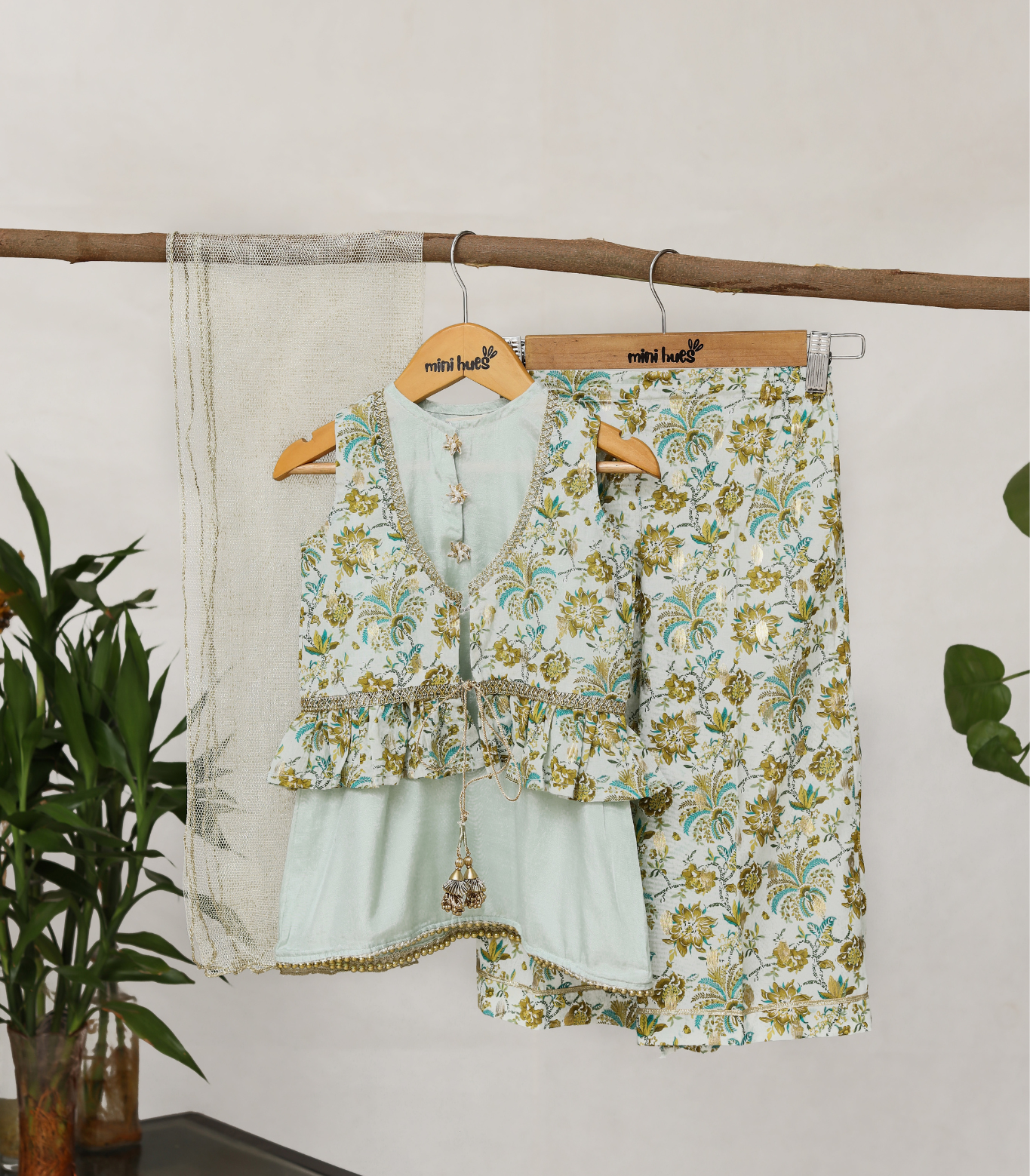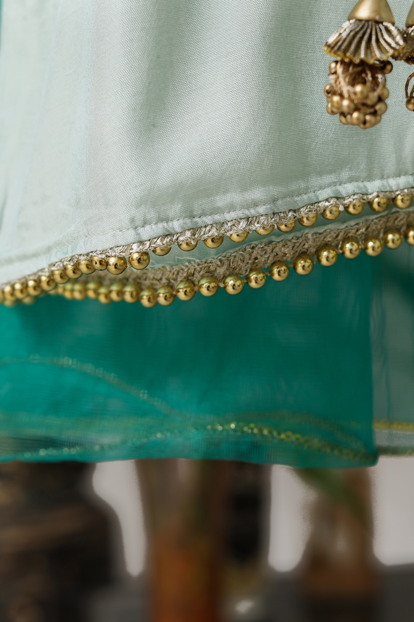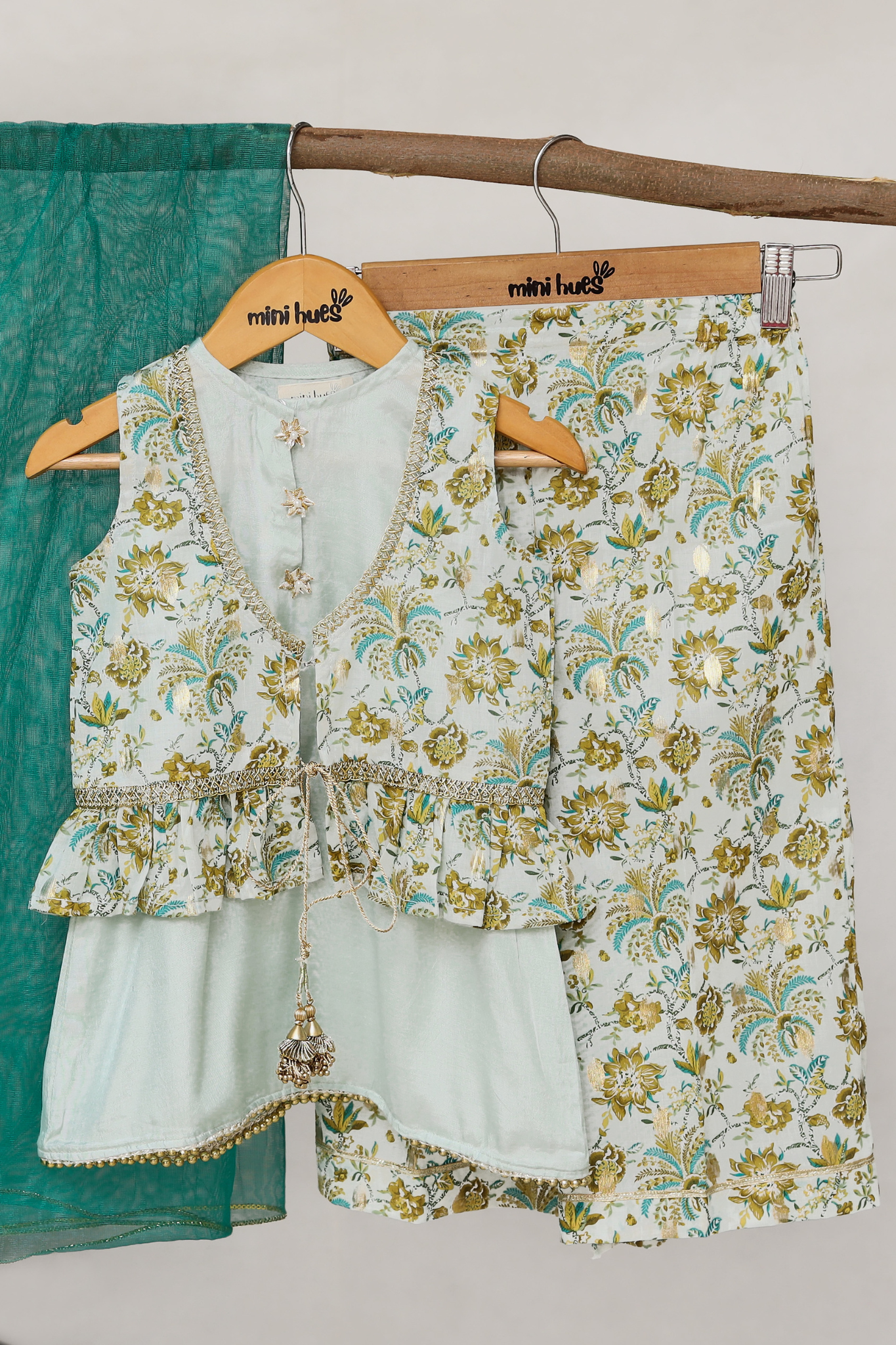 This three-piece set features an aqua blue silk sleeveless flared shirt with gold pearl lace edging and floral gotta buttons, paired with zari-printed flared pants and a sleeveless printed jacket (koti), finished with lace and tassel details.