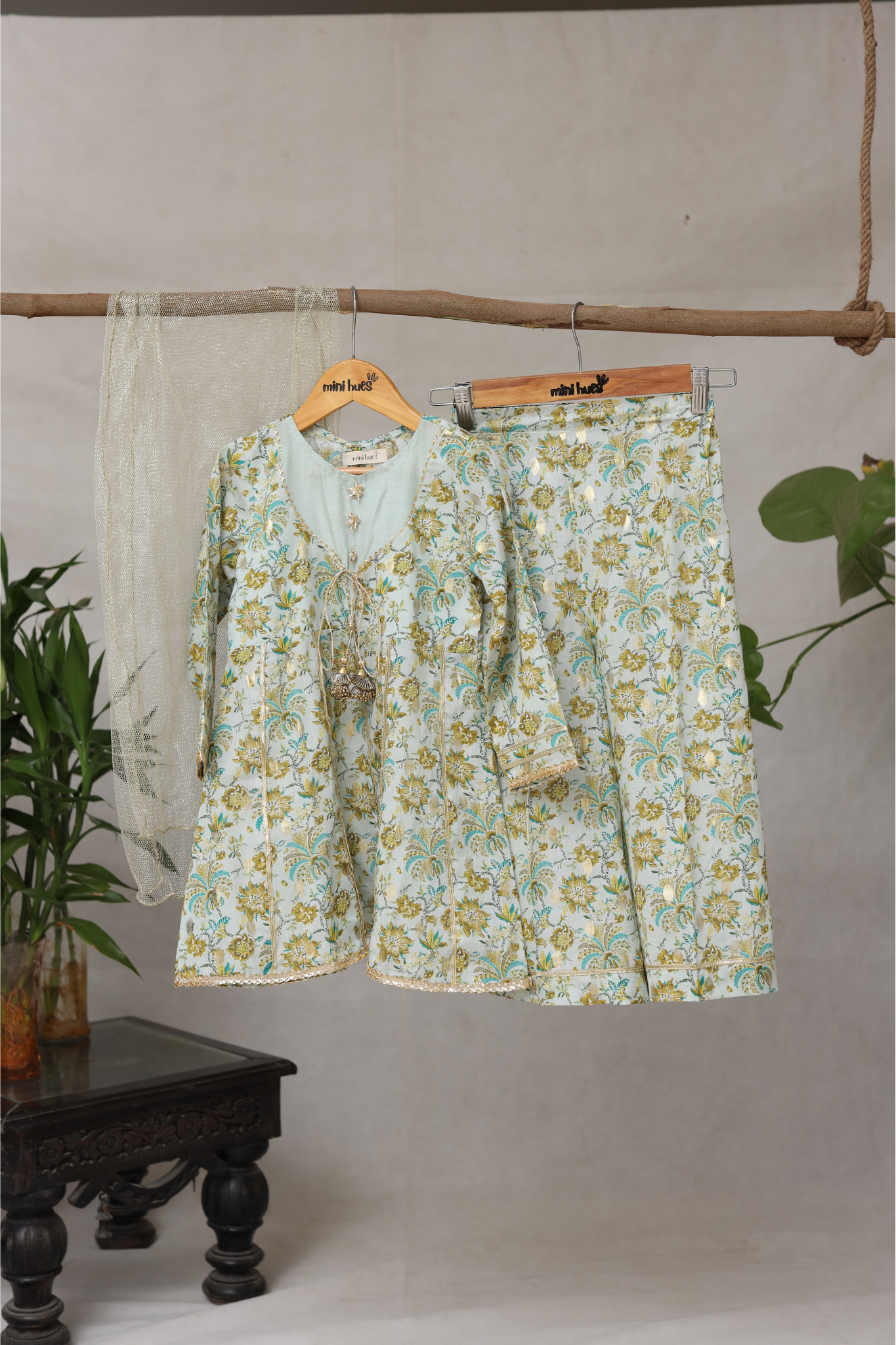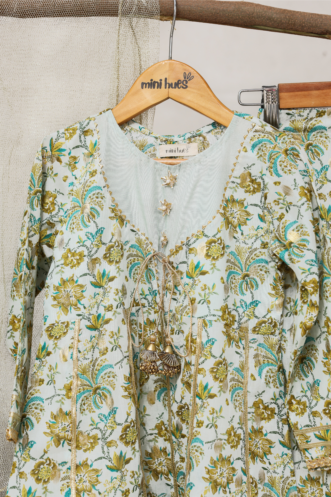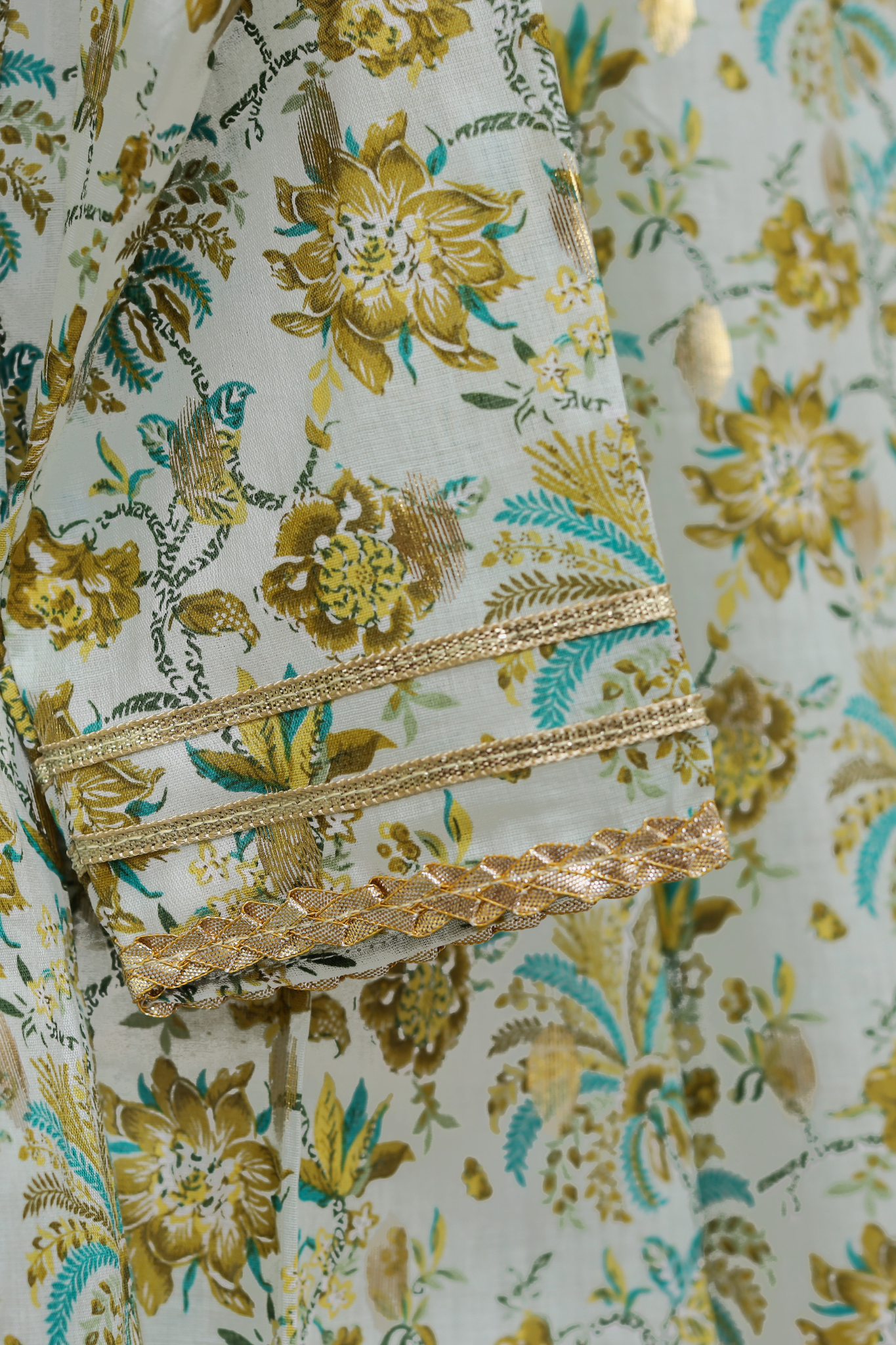 This three-piece ethnic set features a floral gold zari-printed flared shirt with gotta detailing on the front and back panels, delicate gotta flowers along the neckline, and gotta lace with tassels on the front. It is paired with flared pants and a shimmering gold dupatta.