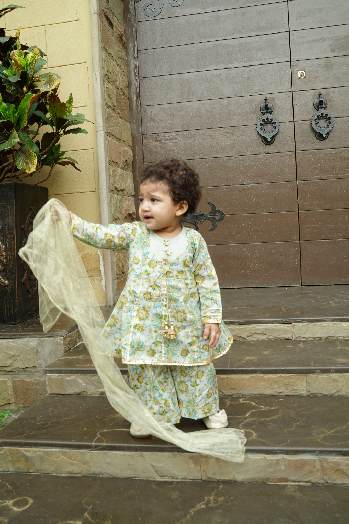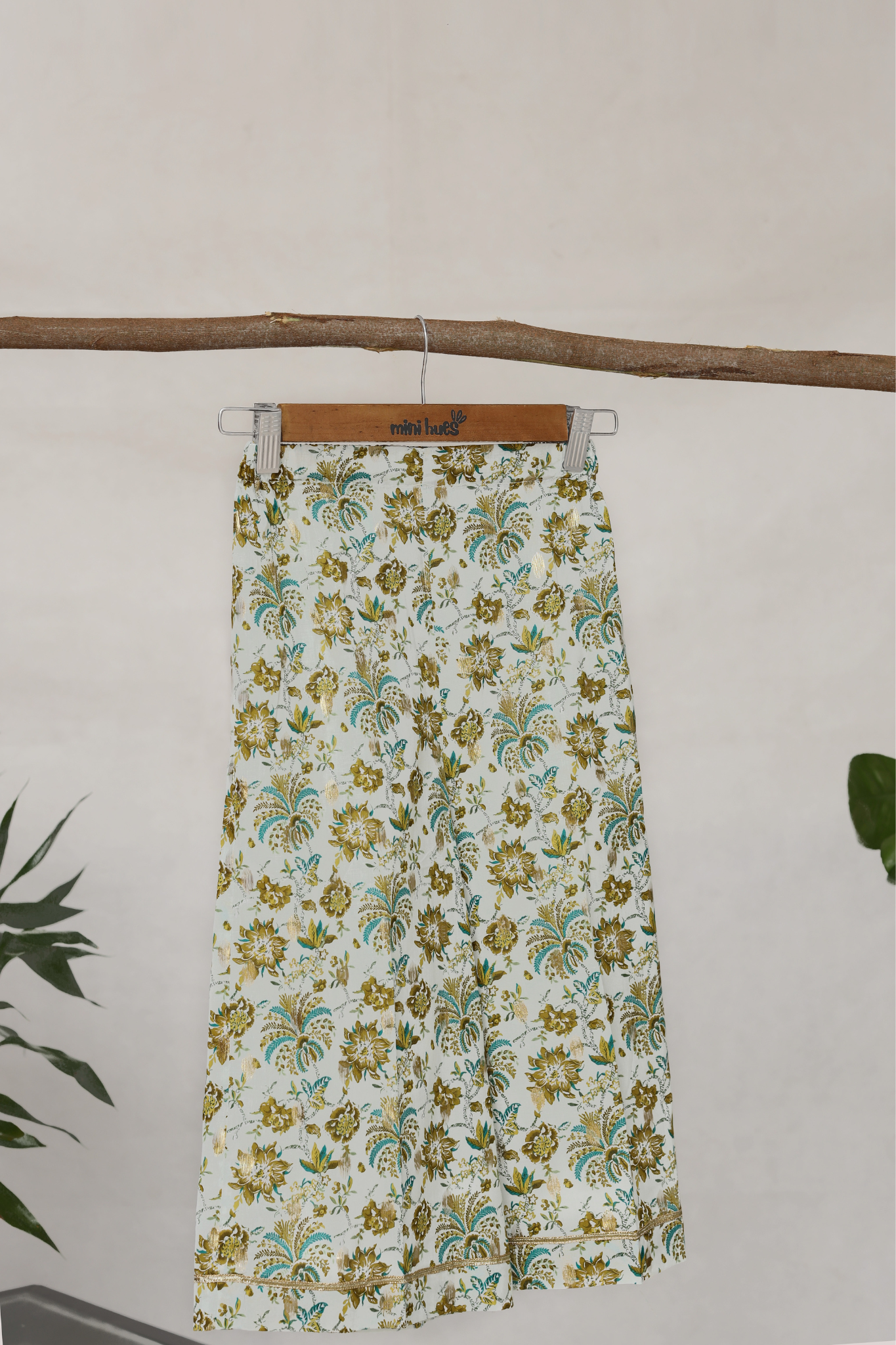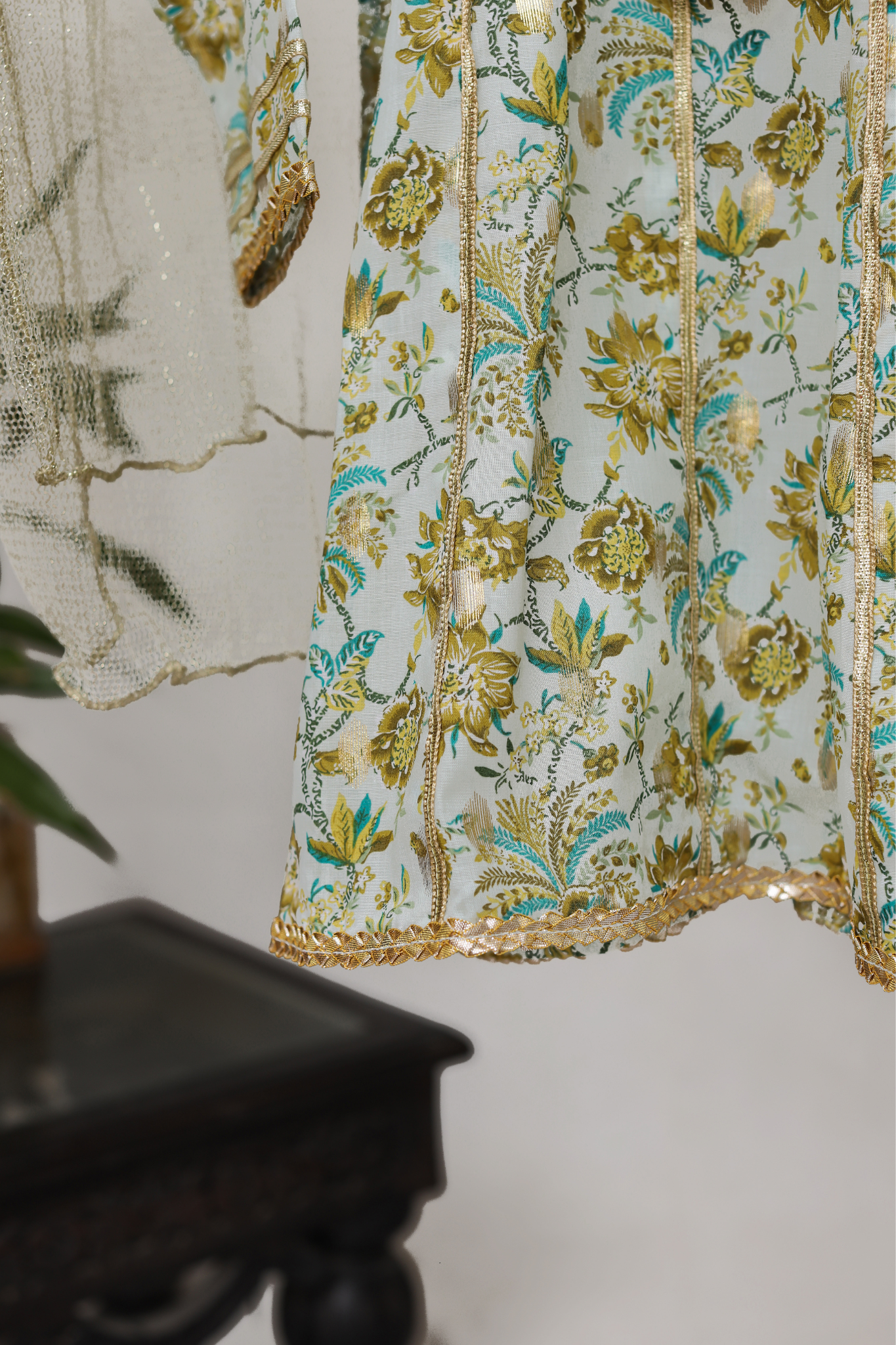 This three-piece ethnic set features a floral gold zari-printed flared shirt with gotta detailing on the front and back panels, delicate gotta flowers along the neckline, and gotta lace with tassels on the front. It is paired with flared pants and a shimmering gold dupatta.