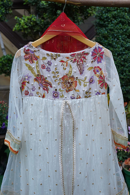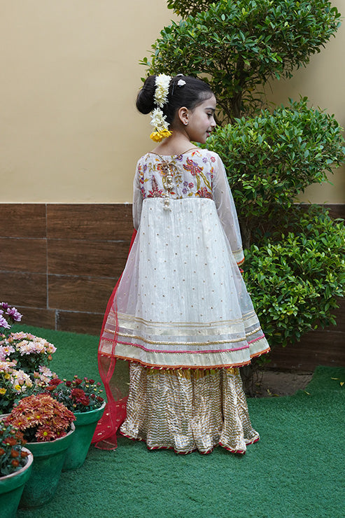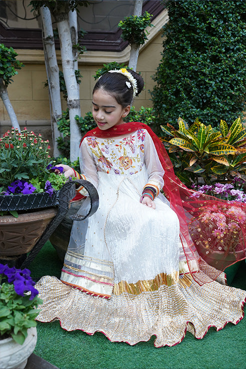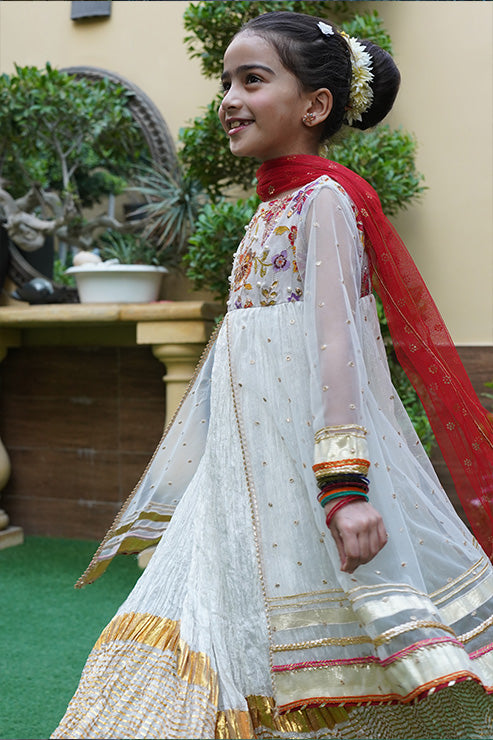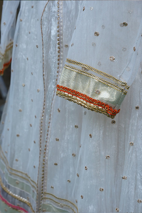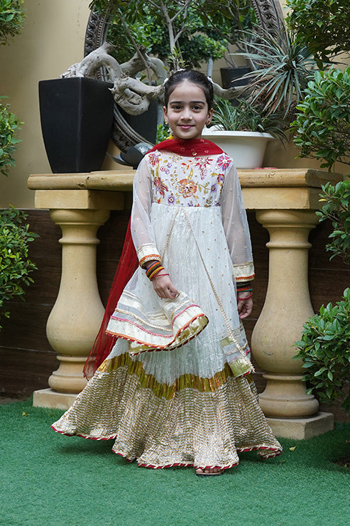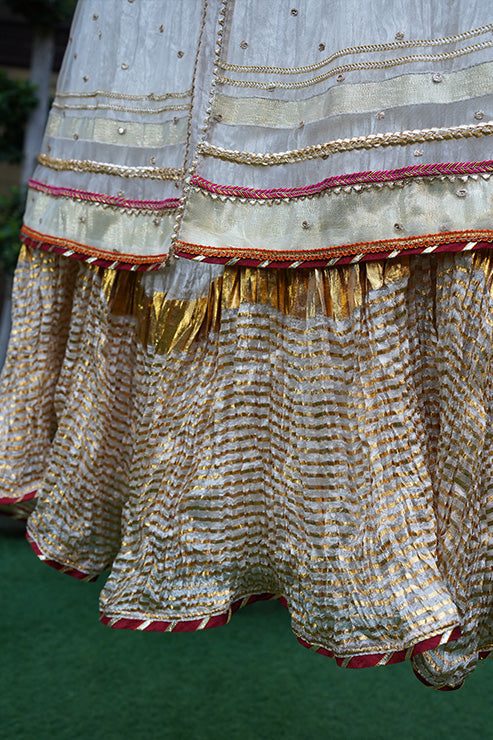 This elegant, trendy ethnic ensemble features a long flared frock with beautiful gold zari stripe print on the hem comes with hand embellished yoke on the front and back, accented with back tassel, it includes a net layer adorned with gota and sequins lace details and embroidered motifs on the front and back, paired with a soft net dupatta.